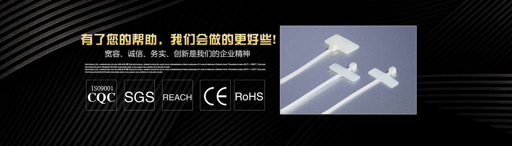 本公司專業生產銷售尼龍扎帶、特殊型扎帶、吸盤(自粘式定位片)、塑料膨脹管、尼龍壓線帽、電纜防水接頭、鋼釘線卡、R型線夾、飛機型線夾、瓷磚定位十字架、固定座、纏繞管、異型管、齒型管、號碼管、熱縮管、黃臘管、扎絲、鋼管蓋等系列產品。 我們擁有先進的檢測設備和雄厚的技術力量,并不斷優(yōu)化生產流程,規(guī)范生產環(huán)節(jié),加強完善質量控制系統,以優(yōu)異的品質深得海內外客戶的一致好評。